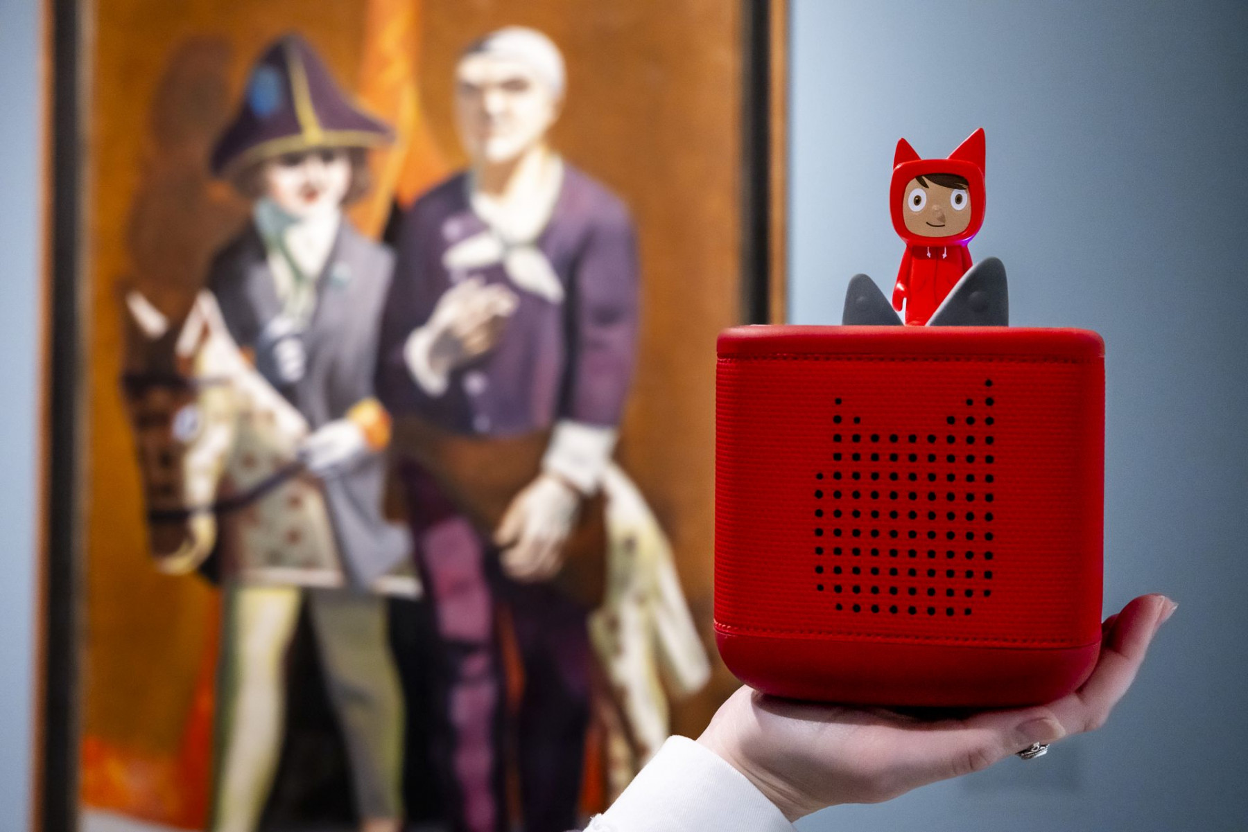 Mit der Toniebox 2 in der Hand gehen kleine Kunstfans gemeinsam mit Rhino Nele und ihren Freunden auf eine Hör- und Entdeckungsreise durch die Sammlung. Die Toniebox kann kostenfrei an der Kasse ausgeliehen werden und begleitet Kinder mit kurzen Geschichten zu ausgewählten Kunstwerken durch das Haus.